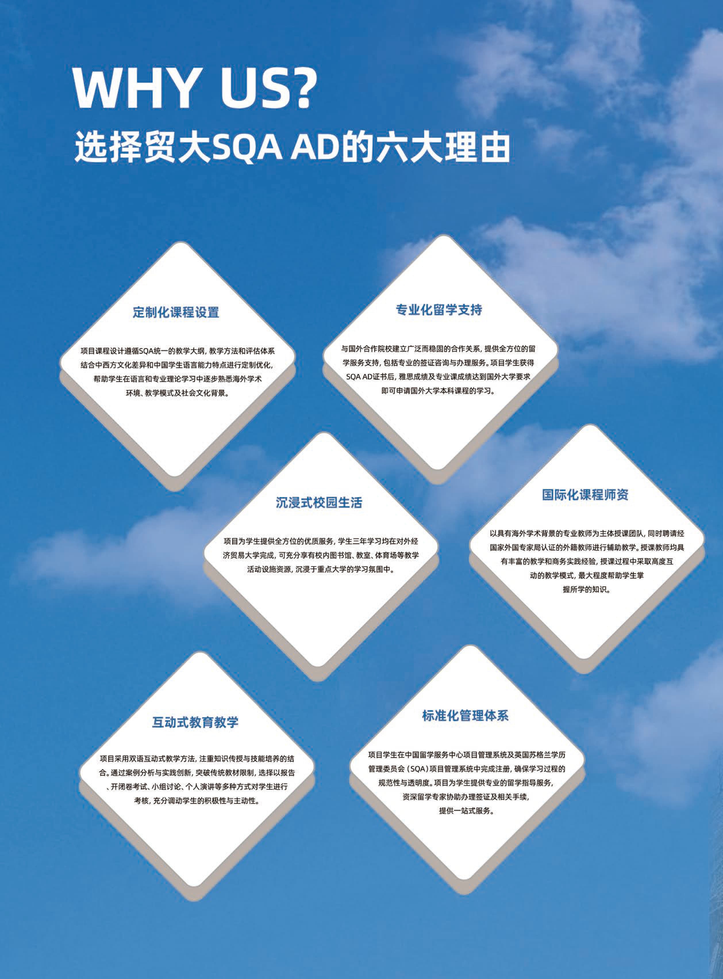 为促进中英两国在教育领域的合作与交流,培养具备国际视野的高层次应用型人才,中国(教育部)留学服务中心(CSCSE)与英国苏格兰学历管理委员会(SQA)自2003年起,共同将英国高等教育文凭项目(SQA AD项目)引入中国。项目将国外高质量的课程体系与国内高校的优质教育资源相结合,以培养具备国际化水平的应用型人才为宗旨,为高中毕业生及同等学力学子提供了安全可靠、费用节省的出国留学路径。
