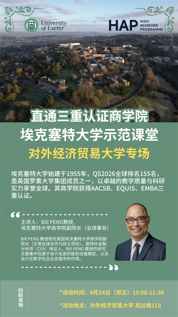 4月24日上午10:00,埃克塞特大学走进贸大:一场不容错过的英式商科课堂