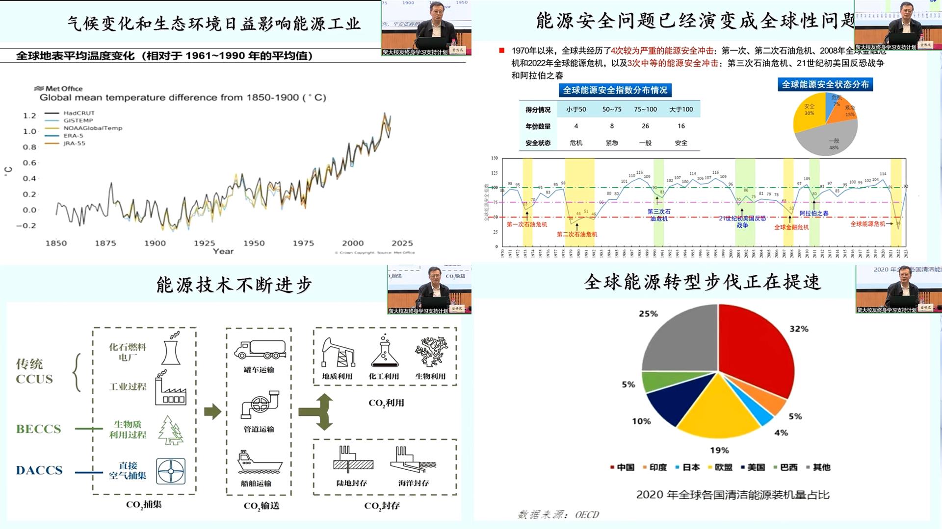 董教授围绕当前化石能源的主导地位、气候变化和生态环境与能源转型、中东局势等能源安全问题对世界能源供需格局的影响、能源技术进步、天然气工业及全球能源提速转型等核心内容,引入大量前沿时事与权威数据,系统梳理了全球能源发展的整体态势,深入剖析了石油、天然气等传统能源与太阳能、风能、核能等新能源协同发展、国际能源合作、世界碳中和进程等关键议题,帮助广大师生、校友全面了解、深度把握全球能源形势的走向与机遇,为理解世界能源变局、研判行业发展趋势提供了专业视角与科学支撑。